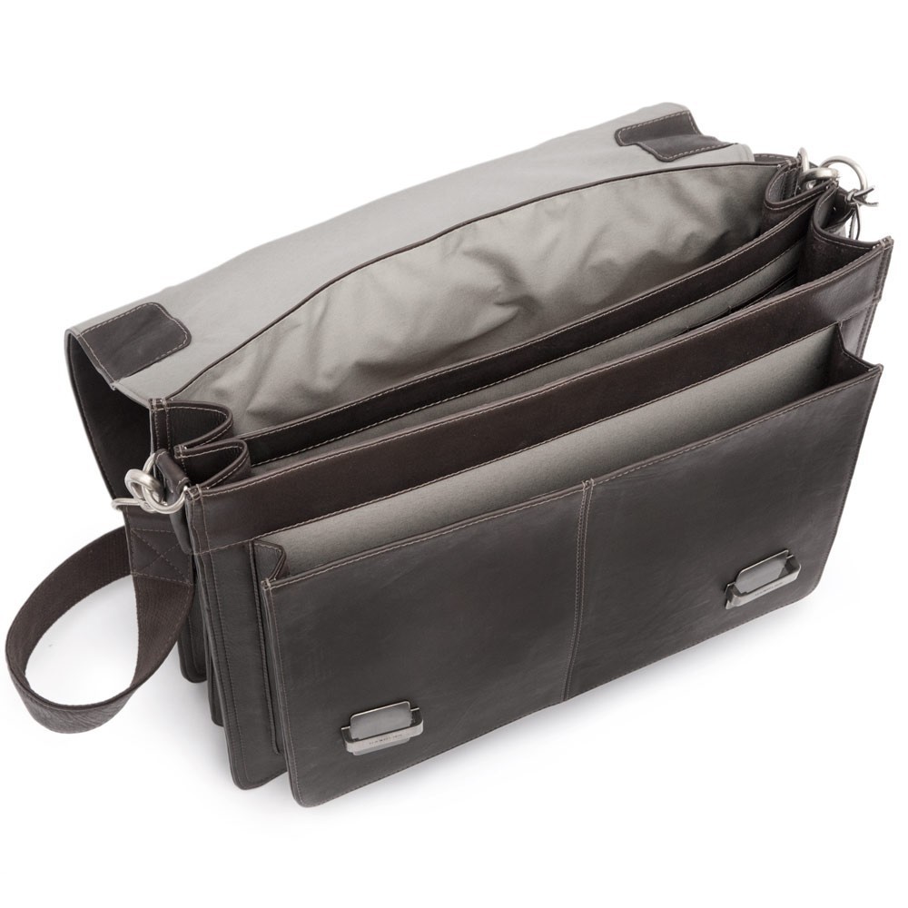 Wenig befüllt glänzt die hochwertige Businesstasche durch ihre schmale Silhouette, dennoch passen bei Bedarf bis zu zwei A4-Aktenordner bzw. ein A4 Ordner und ein 15,6 Zoll Laptop in die elegante Ledertasche hinein.