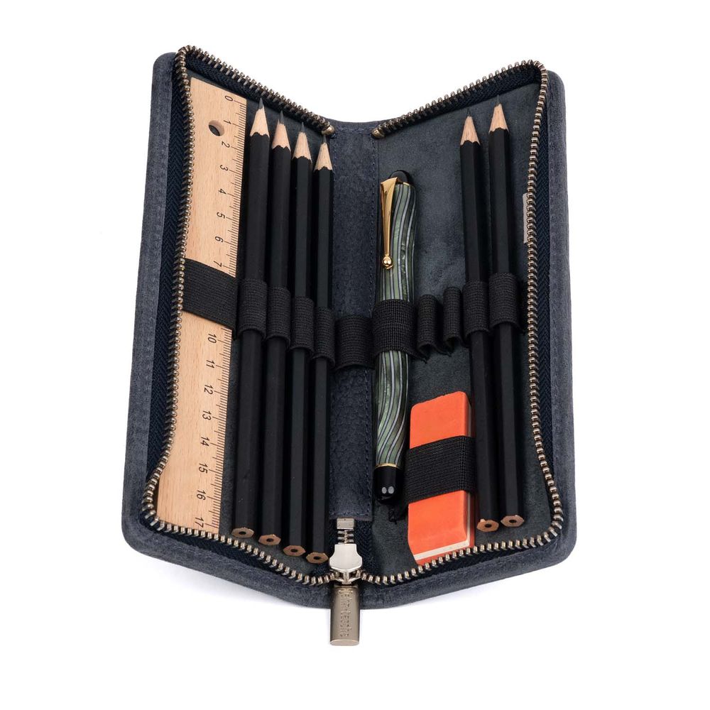 Pencil case / pencil pouch / pencil bag / pen case / pen pouch / pen bag / pencil holder / pencil cover / foldable pencil case / flat pencil case / organised pencil case / stationary pencil case / leather etui / leather case, for writing utensils, pencils, school, uni, office, size M, made out of buffalo leather, hand-crafted, model 012 blue black, for adults, for women and men