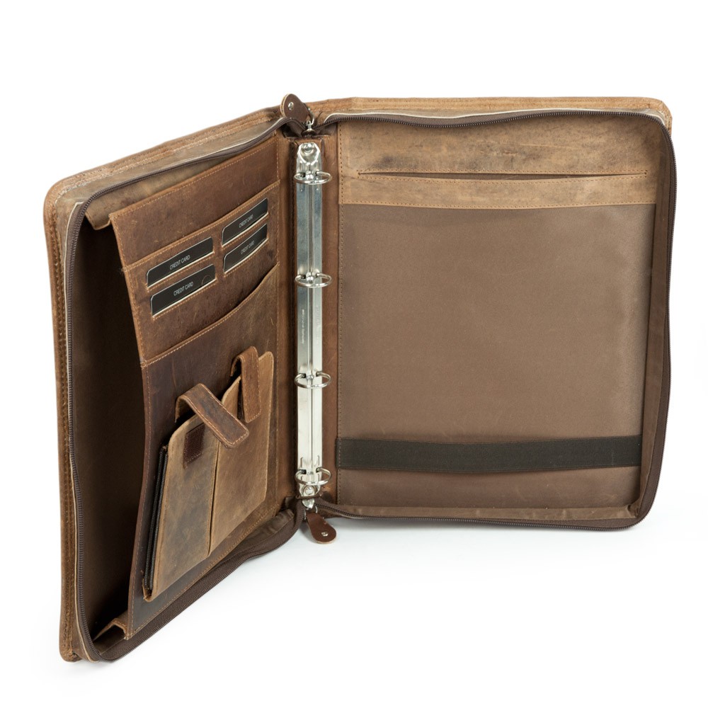 Braune Elegante A4 Schreibmappe / Ringbuchmappe, aus geöltem Leder, für Damen und Herren: