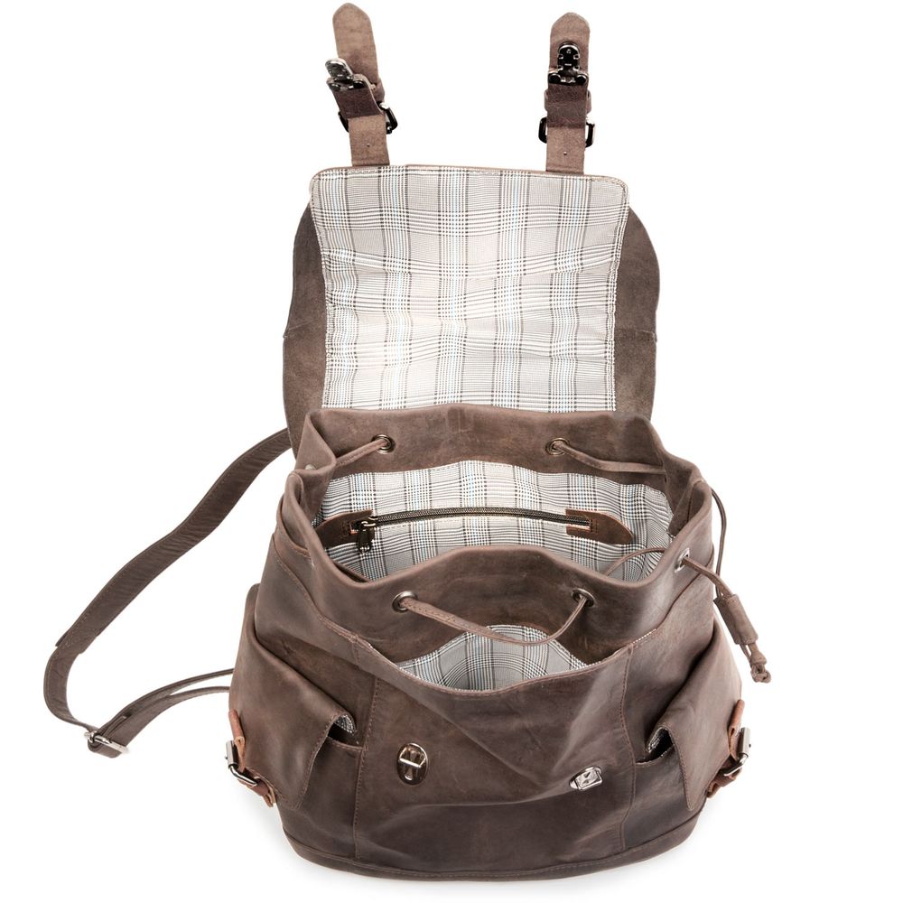 Designerische Raffinessen, wie die hochgezogene Bodenkante, die doppelt verstärkte Aufhängung des Trageriemens und die Seitenflügel des Überschlags dienen ebenso der Optik des Lederrucksacks wie auch der Funktionalität.